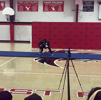Mrs. Madison, a former college gymnast, was coerced on stage by the audience chanting her name for an impromptu performance. She entertained the audience with a cartwheel double back handspring.